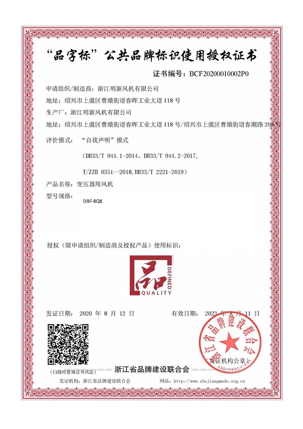 浙江明新風機有限公司依據T/ZZB0351-2018《變壓器專用低噪聲冷卻通風機》,在浙江品牌建設聯(lián)合會網站通過自主申報,于2020年8月12日成功獲得“浙江制造”品字標自我聲明授權證書。